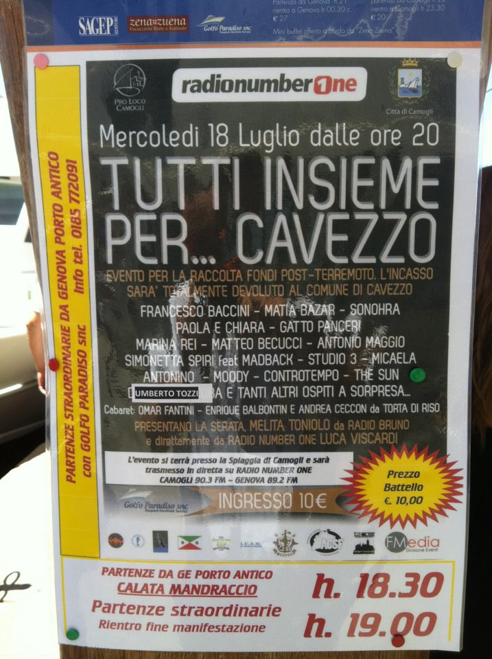 - Concerto per beneficenza “terremoto di Cavezzo” (insieme a Tozzi, Marina Rei, Sonohra, Matia Bazar, Paola e Chiara, Baccini, Gatto Panceri, etc…) pubblico 3000 persone